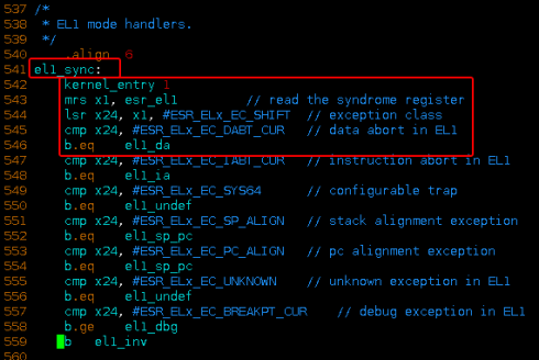 kernel_entry保存完第一现场之后,接下来读取esr_el1寄存器的值,并判断异常的具体类型。如2.3.5章节所描述的ESR寄存器定义,ESR包含的异常信息主要用于异常处理程序确定异常原因,其中ESR_ELn的BIT[31:26] EC域指示处理程序执行的对应异常类型。