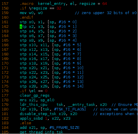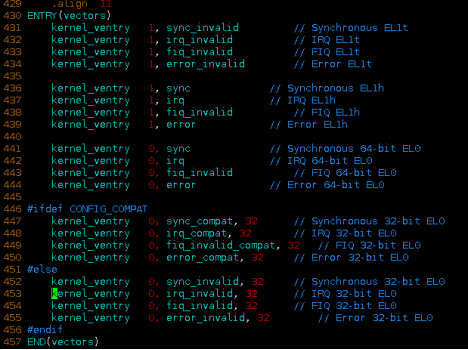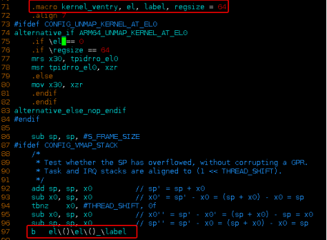 异常发生后,处理器从对应的异常向量表入口地址开始执行,第一条指令是kernel_ventry。kernel_ventry是一个宏定义,先检查栈空间是否有溢出,然后跳转到指定的异常处理标签。