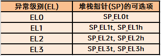 在AArch64状态下,除了通用寄存器外,还为以下每个异常级别实现了专用的堆栈指针寄存器,