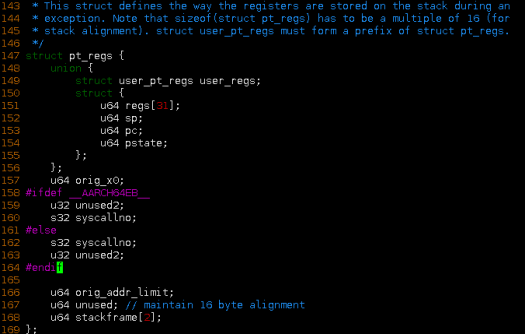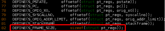 其次设置栈帧大小S_FRAM_SIZE,S_FRAM_SIZE根据pt_regs结构体大小而设定。