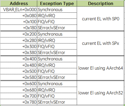 当发生异常时,处理器必须执行与之对应的处理程序。处理程序在内存中的存储位置称为异常向量。在ARM体系结构中,异常向量存储在一个表中,该表称为异常向量表。每个异常级别都有其自己的向量表,即EL3,EL2和EL1都有一个,该表包含要执行的指令。