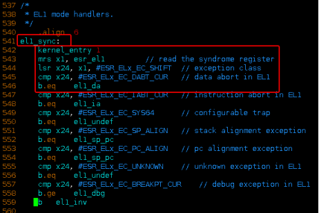发生DataAbort时,EC = 0b100101,即ESR_ELx_EC_DABT_CUR=0x25,el1_syn将跳转至el1_da。