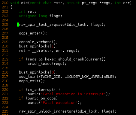 die函数最终可能会调用到panic。但die函数也不是一定会走到panic,它先是走oops流程告警系统现在的异常,如果异常发生在中断上下文,走panic。或者如果设定了CONFIG_PANIC_ON_OOPS_VALUE=y,无论是否在中断上下文均走panic。