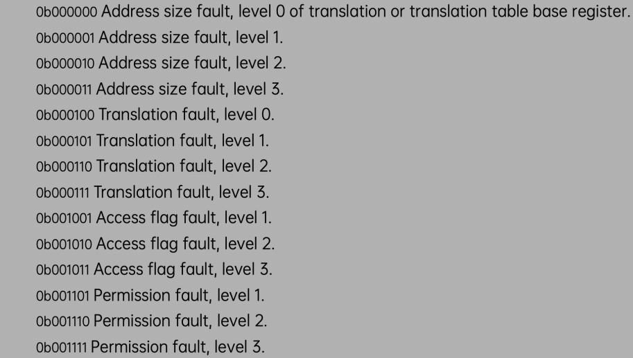 BIT[5:0] DFSC(Data Fault Status Code)解释了data abort发生的状态信息: