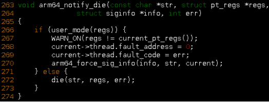 最后,调用arm64_notify_die,如果是用户空间发生data abort,输出异常信息和发送signal给当前进程。如果是异常发生在内核空间,走die流程。