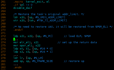如果此次异常并没有走到panic流程,那么系统还是要继续运行,抛出oops警告后系统如何恢复异常发生前的环境?回到el1_da处理指令,do_mem_abort执行完如果不需要panic,跳转到kernel_exit进行异常退出处理。