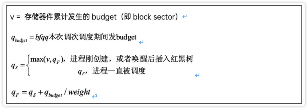 bfq通过budget(就是block sector)确保公平,不管进程占用了存储设备多长时间,只管进程访问存储设备的数据量。