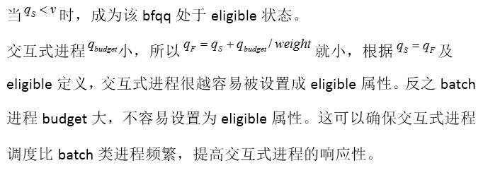 bfq的这种思想带来了一个优势,即提高了交互式进程的响应性。因为交互式进程每次IO的数据量很少,而batch类进程数据量很大,为了确保budget公平(访问相同数量的block sector),必须频繁调度交互式进程运行,从而提高了交互式进程的响应性。