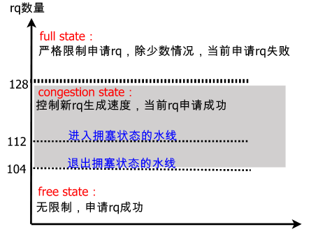 在single-queue中用rq资源池管理request的申请释放,一个存储器件的读写请求数量各自限制最多q->nr_requests个(默认的q->nr_requests = BLKDEV_MAX_RQ = 128)。当该器件上待处理的读或写请求数超过=7/8 * q->nr_requests时进入拥塞状态,此时会限制新生成request的速度。比如读请求拥塞时,page_cache_async_readahead函数中关闭预读功能以较少新生成的request。当存储器件待处理读或写的request比