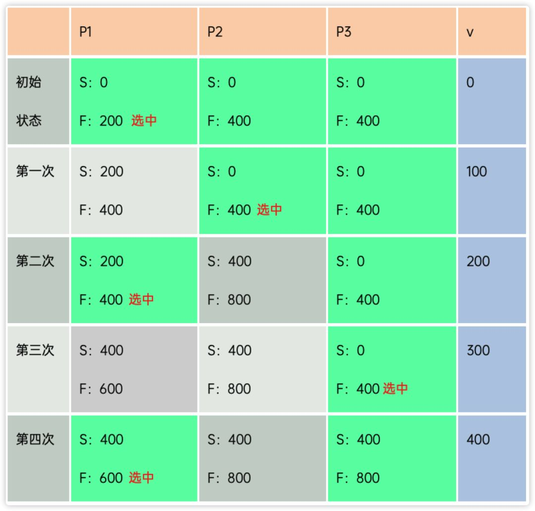 从上面执行步骤可以看出,P权重占比50%,第一次到第三次下来,P1执行2次,P2、P3累计执行2次,执行的频率与各进程的权重占比相等。