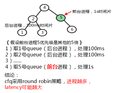 “虚拟”时间片 = 实际访问存储设备时间*优先级系数,优先级越高实际获得的时间片越长,优先级越低实际获得的时间片越短。