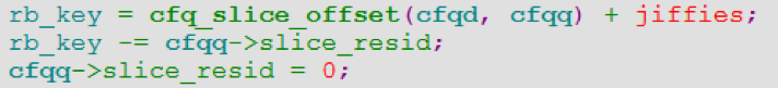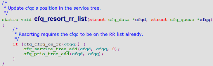 cfqq用完时间片后,通过cfq_resor_rr_list调整cfqq在红黑树中的位置,由于红黑树key值rb_key近似等于jiffies,所以cfqq近似于按照round-roubin执行,代码如下。