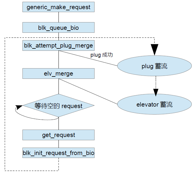 bio生成后,就plug到进程的plug_list里面,如果失败,则进电梯merge,如果依然失败,则只能等待新的request被释放出来,两次蓄流的目的是为了尽可能的让bio请求得到merge,减少往磁盘驱动下发的频度,提升综合性能。
