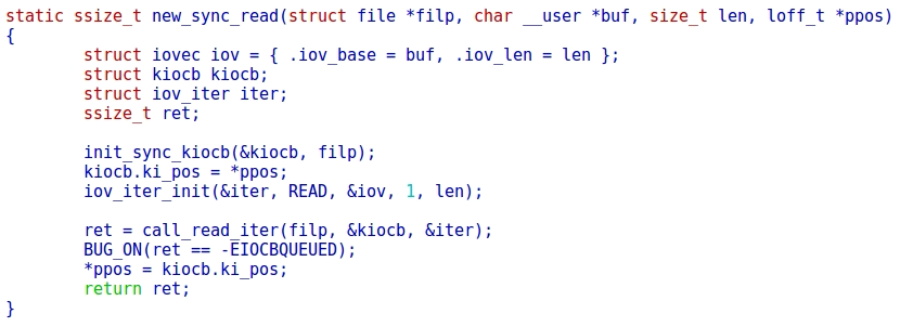 如上图所示,用户态传入fd, buf, count的参数被传入到kiocb和iov_iter里面,kiocb用来传递磁盘地址,而iov_iter用来传递buf。