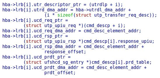 申请好的两端dma内存写进UFSHCI寄存器,controller最后通过这两个内存地址完成全部的数据交互过程,其原理就是base + index * unit 的索引方式: