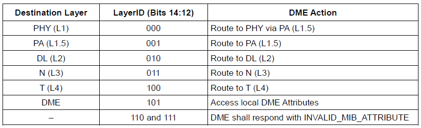 DME(Device Management Entity)对Unipro的所有层次进行控制和管理,提供各层次所有的寄存器的访问接口。这个接口通过UIC实现,Unipro各个层次的寄存器都是通过UIC来访问的。那么统一的UIC接口是如何实现各层次寄存器路由的呢,就是通过下面的LayerID实现的,通过寄存器address的bits【14:12】做掩码。