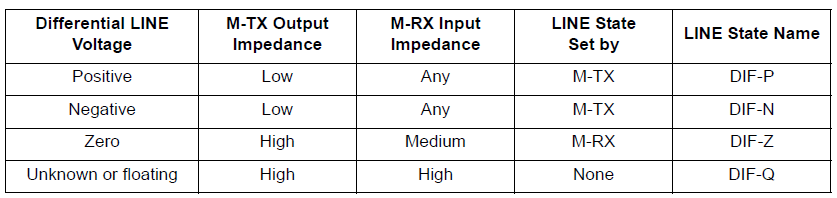 通过驱动控制TX两个差分点TXDP/TXDN的电压,以及对端RX接收机RXDP/RXDN的阻抗,形成如下的4种差分线状态: