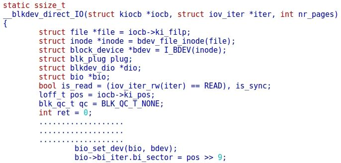 _blkdev_direct_IO函数中从iocb传递磁盘地址bio->bi_sector,同时iov_iter传递给bio的bi_iter:
