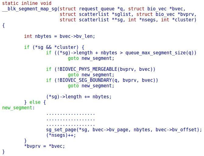 __blk_segment_map_sg实现bio到request里面的sglist的数据填充:bio里面的bv_page是将要进行读的buffer地址,这个地址被挂载到sg链表,sg操作将会对应UFS里面的PRDT,这时候的bv_page为DMA可以直接访问的物理地址。