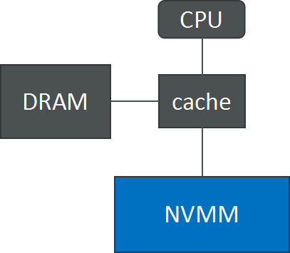 NVMM是对多种新型非易失存储介质的统称,目前的NVMM包括:相变存储器 Phase-Change Memory (PCM)、忆阻器 Memristor(ReRAM)、自旋扭矩转换随机存储器 Spin Transfer Torque - Magnetic Random Access Memory (STT-MRAM)等等。PCM是通过硫系化合物非晶和多晶之间的快速相变来实现信息存储的,ReRAM则是基于一种特殊的二氧化钛材料实现纳米级忆阻器实现数据存储,STT-MRAM的物理机制是磁致阻变效应。以上新型非易失存储介质所用材料虽然各有不同,但都有着低延迟、高密度、可字节寻址等优异特性。相比基于浮栅晶体管的NAND Flash确实可称得上是革命性创新。