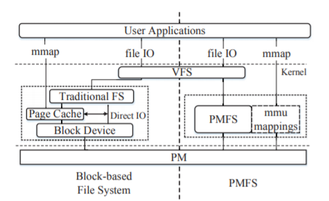 现有的Linux存储软件栈完全是按照主存和辅存上下级形式设计的,Page Cache非常有效的弥补了DRAM和硬盘之间的性能鸿沟,极大的提升了文件读写的性能。然而在新型非易失存储出现后,接近DRAM的低延迟让Page Cache变成了负担。硬件性能的提升让软件栈的开销变得不可忽略——这是很多硬件设计改变引发软件变革的核心逻辑。基于这一逻辑,我们看到了很多在数据库、文件系统上的新工作涌现。如下图所示为英特尔开发的面向非易失存储的文件系统PMFS,跳过了Page Cache和块设备层,读写设备的形式也和内存访问一致,极大的减少了软件层面引入的开销。