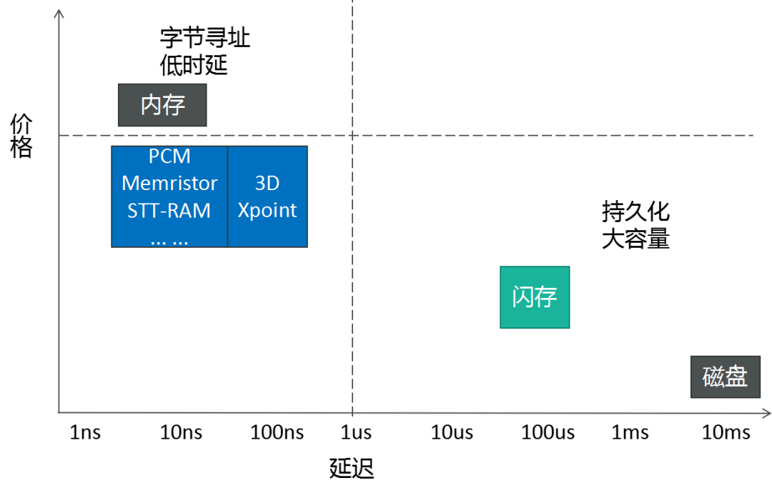存储器件的定位和用途一般要考虑延迟、寿命、成本、容量、可持久化等多方面的因素,主存(Memory)和辅存(Storage)之间有很大的特性差别:主存要求极低延迟、字节寻址,辅存要求大容量、持久化。主存和辅存是上下层级关系,而新型非易失存储的出现让我们看到了同时满足低时延、字节寻址、持久化、大容量的理想存储形态。