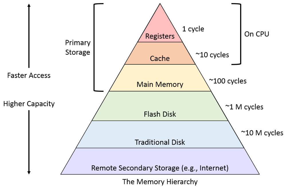 业界在新型非易失存储上搞的热火朝天,性能到底如何呢?实验室中的数值不算数,我们还是以能量产的3D Xpoint作为参考:目前Optane Memory的读延迟大约是350 ns,这是一个比较让人“亦可赛艇”的数值了。要知道DRAM的读延迟大约是100 ns,至少已经看到了DRAM的尾灯(在一个数量级上)。参考下图中的存储层次体系,3D Xpoint确实已经一只脚迈进了主存的区间,甩了闪存一大截。因此,当我们思考如何使用新型非易失存储时会发现有了很大的想象空间。