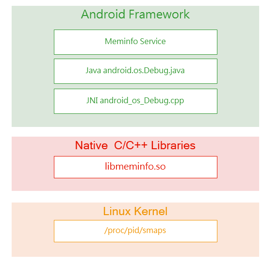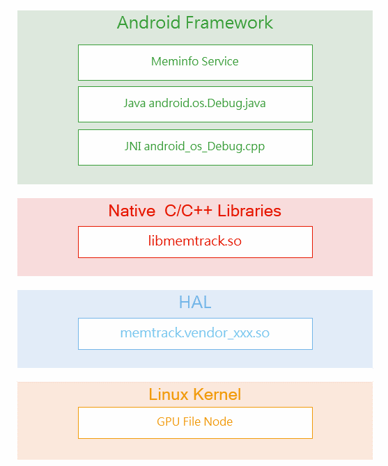 通过以下三个方式,图中A.1部分的信息是通过解析/proc/pid/smaps获得的, A.2 通过IPC (binder 和pipe)方式获得。而A.3通过memtrack.vendor_xxx.so中的接口获得的。