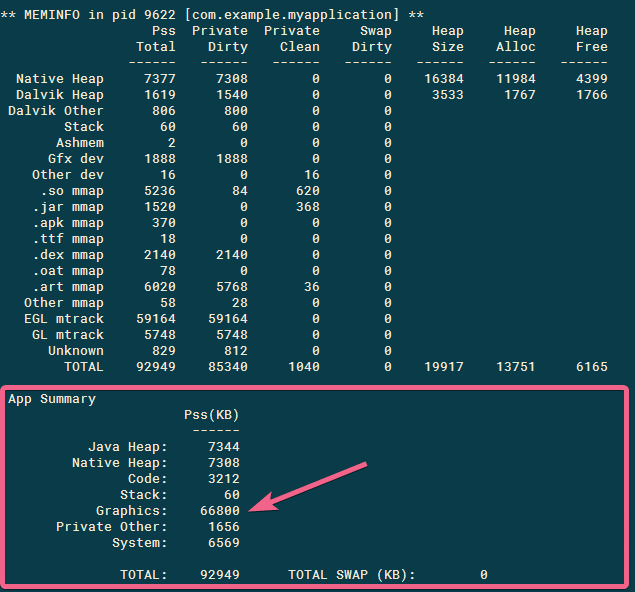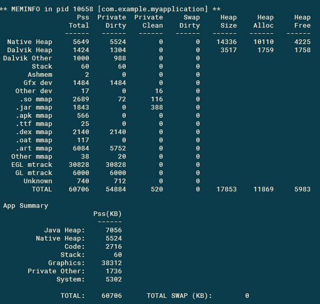 当我们查看应用的内存消耗情况时,可以通过meminfo提供的信息,判断应用中哪个模块使用的内存出现问题。