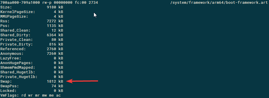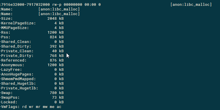 但下面这段vma是文件映射的,但还有swap字段的,这是因为这个文件是通过mmap到进程地址空间的。当标记中有MAP_PRIVATE时,这表示是一个copy-on-write的映射,虽然是file-backed , 但当向这个数据写入数据的时候,会把数据拷贝到匿名页里,所以看到上面的Anonymous:也不为0。