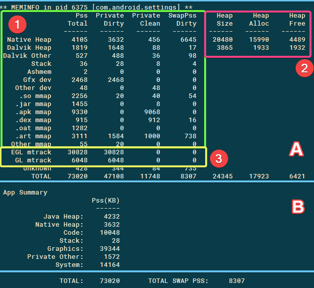 上面图中的数据分A和B两个部分, A 部分是进程内存的详细信息, B 部分是对详细信息进行的总结。