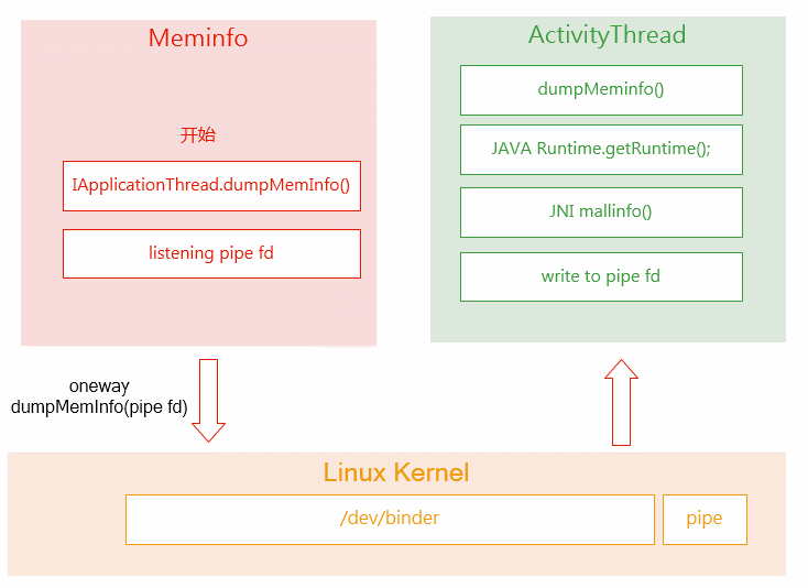 Meminfo打开一个pipe,通过异步binder调用并传递了pipe fd, 然后开始监听fd,应用进程获得了这个pipe fd后 读取需要的内存数据,通过pipe传递到AMS中。