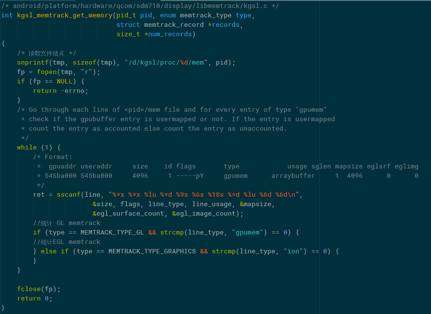 每个厂商统计的策略可能不一样,这也是出现HAL层的原因. 下面以高通SDM710为例。从代码中可以看到也是读内核中GPU文件节点,然后解析数据的。