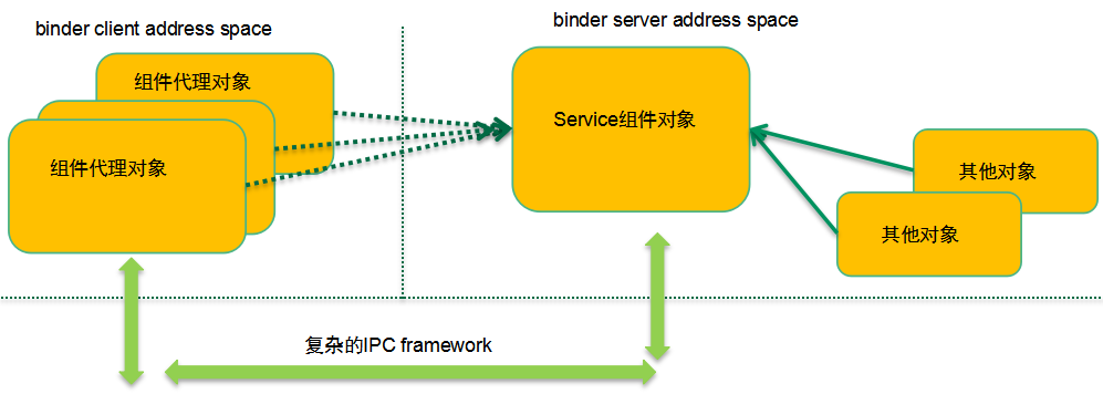 当然,基于目前Linux内核的IPC机制,也可以构建复杂的IPC framework,不过传统的内核IPC机制并没有考虑面向对象的应用框架,因此很多地方实现起来有些水土不服。上图给了一个简单的例子:在一个地址空间中跟踪对象的引用计数非常简单,可以在该对象内部构建一个引用计数,每当有本进程对象引用service组件对象的时候,引用计数加一,不再引用的时候减一,没有任何对象引用service组件对象的时候,该对象可以被销毁。不过,当引用该service组件的代理对象来自其他进程空间(例如binder client的组件代理对象)的时候,事情就不那么简单了,这需要一个复杂的IPC framework来小心的维护组件对象的引用计数,否则在server端销毁了一个组件对象,而实际上有可能在client端还在远程调度该service组件提供的服务。