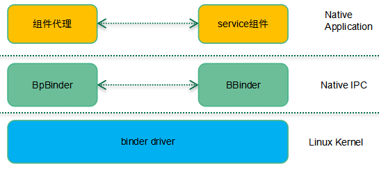 所有的通信协议都是分层的,binder也不例外,只不过简单一些。Binder通信主要有三层:应用层,IPC层,内核层。如果使用Java写应用,那么IPC层次要更丰富一些,需要通过Java layer、jni和Native IPC layer完成所有的IPC通信过程。如果使用C++在Native层写应用,那么基本上BpBinder和BBinder这样的Native IPC机制就足够了,这时候,软件结构退化成(后续我们基本上是基于这个软件结构描述):