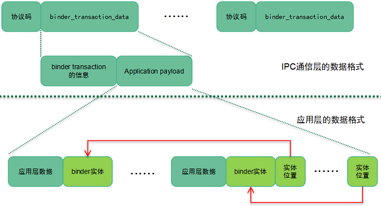 本身应用层的数据应该是通信两端的实体自己的事情,不过由于需要交互binder实体对象信息,因此这里也简单描述其数据格式,如下: