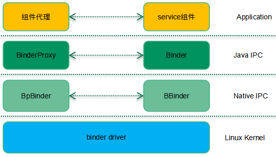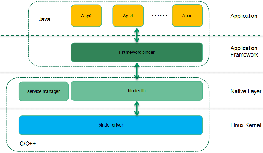 Binder渗透到了安卓系统的各个软件层次:在应用层,利用Framework中的binder Java接口,开发者可以方便的申请系统服务提供的服务、实现自定义Service组件并开放给其他模块等。由于Native层的binder库使用的是C++,因此安卓框架中的Binder模块会通过JNI接口进入C/C++世界。在最底层,Linux内核提供了binder驱动,完成进程间通信的功能。