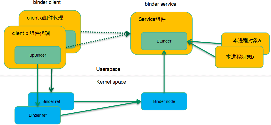 为了解决这个问题,binder驱动构建了binder ref和binder node数据对象,分别对应到上层软件中的service组件代理和service组件对象,同时也设计了相应的binder通信协议来维护引用计数,解决了传统的IPC机制很难解决的跨进程对象生命周期问题。