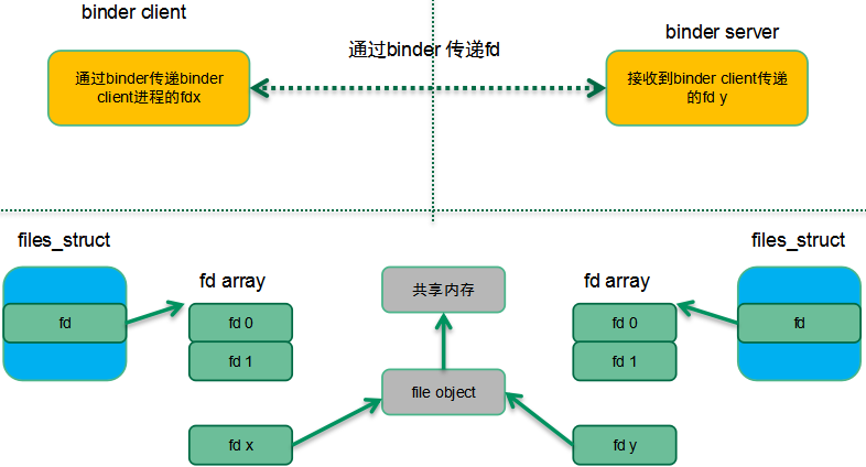 并不是说安卓不使用共享内存机制,实际上当进程之间要传递大量的数据的时候(例如APP的图形数据要传递到surfaceflinger进行实际的显示)还是使用了share memory机制(Ashmem)。安卓使用文件描述符来标示一块匿名共享内存,binder机制可以把文件描述符从一个进程传递到另外的进程,完成文件的共享。一个简单的示意图如下: