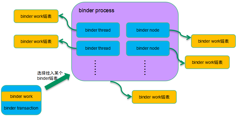 对于异步binder通信,work是挂入binder node对应的work链表。如果是同步binder通信,那么要看是否能够找到空闲的binder thread,如果找到那么挂入线程的work todo list,否则挂入binder process的链表。
