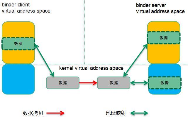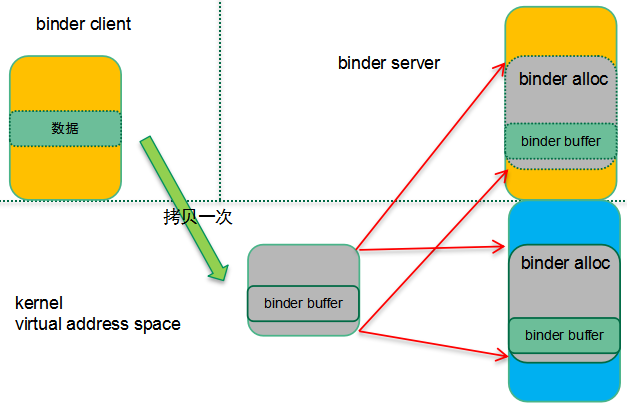 binder server会有专门二段用于binder通信的虚拟内存区间,一段在内核态,一段在用户空间。这两段虚拟地址空间映射到同样的物理地址上,当拷贝数据到binder server的内核态地址空间,实际上用户态也就可以直接访问了。当Binder client要把一个数据块传递到binder server(通过binder transaction)的时候,实际上会在binder server的内核虚拟地址空间中分配一块内存,并把binder client的用户地址空间的数据拷贝到binder server的内核空间。因为binder server的binder内存区域被同时映射到用户空间和内核空间,因此就可以省略一次数据考虑,提高了性能。