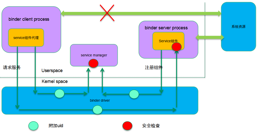 b.系统把特定的资源权限赋权给Binder server(service组件绑定的进程),当binder client请求服务的时候对uid进行安全检查。