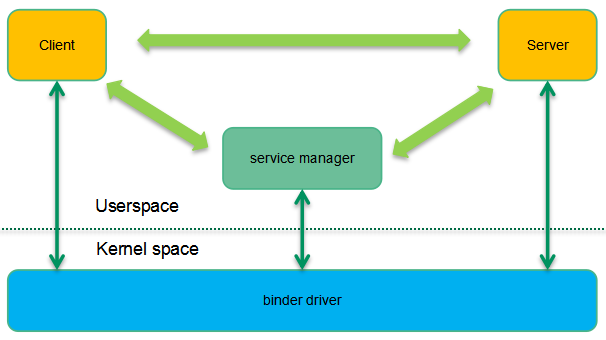 从进程角度看,参与Binder通信的实体有三个:binder client、binder server和service manager。Binder server中的service组件对外提供了服务,但是需要对外公布,因此它会向service manager注册自己的服务。Binder client想要请求服务的时候统一到service manager去查询,获取了对应的描述符后即可以通过该描述符和service组件进行通信。当然,这些IPC通信并不是直接在client、server和service manager之间进行的,而都是需要通过binder driver间接完成。