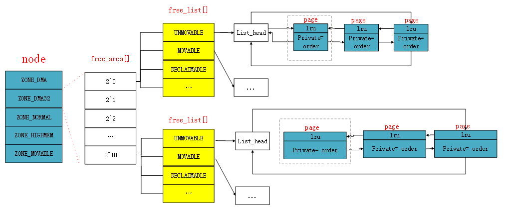 free_area管理的内存还细分为各种类型,例如不可移动页面和可移动页面等,每种类型的页面类型对应一个free_list链表,该链表就链接着页面结构体。