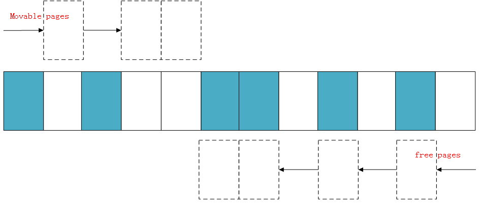 下面演示一下内存规整的简化工作原理,内核会运行两个独立的扫描动作:第一个扫描从内存域的底部开始,一边扫描一边将已分配的可移动(MOVABLE)页面记录到一个列表中:
