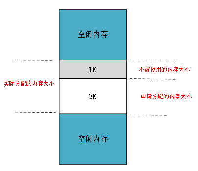例如进程需要使用3K bytes物理内存,于是向系统申请了大小等于3Kbytes的内存,但是由于Linux内核伙伴系统算法最小颗粒是4K bytes,所以分配的是4Kbytes内存,那么其中1K bytes未被使用的内存就是内存内碎片。
