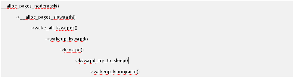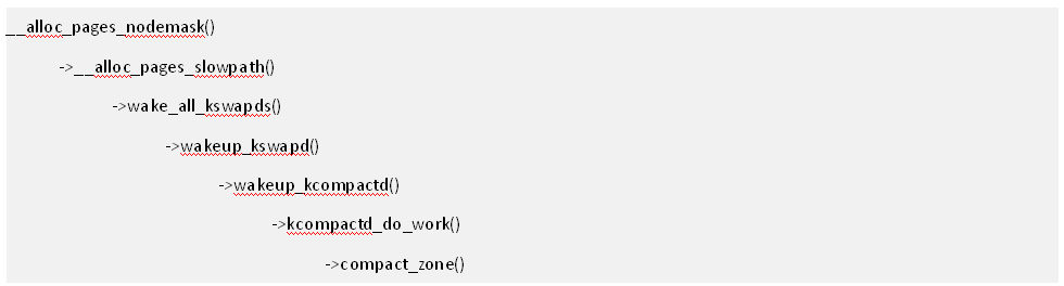 打开如上配置后,内存规整的触发是自动的,触发内存规整的途径如下:当进程尝试分配高阶内存无法满足并且完成direct_reclaim#1(暂不分析costly_order情况)后,系统会根据内存剩余判断是否触发内存规整;