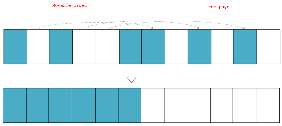 等两个扫描在域中间相遇,意味着扫描结束,然后将左边扫描得到的已分配的页面迁移到右边空闲的页面中,左边就形成了一段连续的物理内存,完成页面规整。
