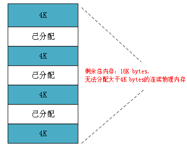 例如系统剩余内存为16K bytes,但是这16K bytes内存是由4个4K bytes的页面组成,即16K内存物理页帧号#1不连续。在系统剩余16K bytes内存的情况下,系统却无法成功分配大于4K的连续物理内存,该情况就是内存外碎片导致,本文中阐述的就是物理内存外碎片化。
