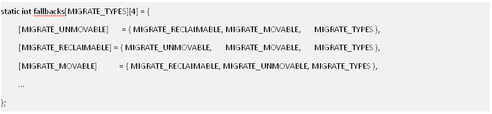 以下数组明确了各种页面类型可偷的页面类型,例如第一行表示UNMOVABLE页面可以偷RECLAIMABLE和MOVABLE类型的页面,其他类似。